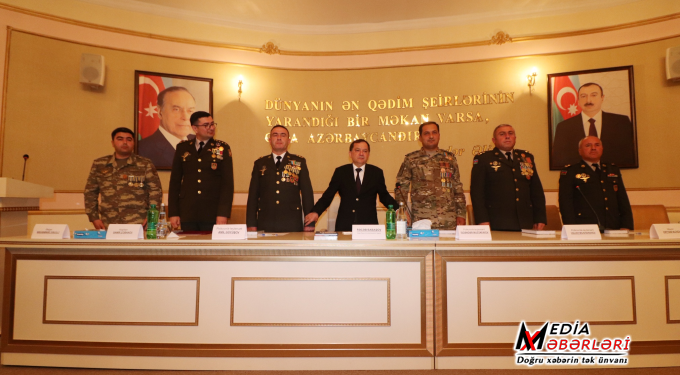 3-cü dərəcəli Vətən müharibəsi əlili, “Hərbi xidmətlərə görə”, “Xocavəndin azad olunmasına görə”, “Füzulinin azad olunmasına görə”, “Şuşanın azad olunmasına görə”, “Vətən müharibəsi iştirakçısı” medalları ilə təltif edilmiş polkovnik-leytenant Valeh Mustafayev çıxış edərək gənclərə səmimi ürək sözlərini, dəyərli fikirlərini çatdırıb. Müzəffər Ali Baş Komandan İlham Əliyevin düşünülmüş siyasəti nəticəsində hərbçilərimizin döyüş meydanında tarixi qələbə qazanmasında xalqımızın da böyük rolunun olduğunu vurğulayıb. 44 günlük haqq savaşında xalqımızın ordumuzun ətrafında bir yumuruq tək birləşdiklərini, bu birlik sayəsində qələbə qazandığımızı qeyd edib.