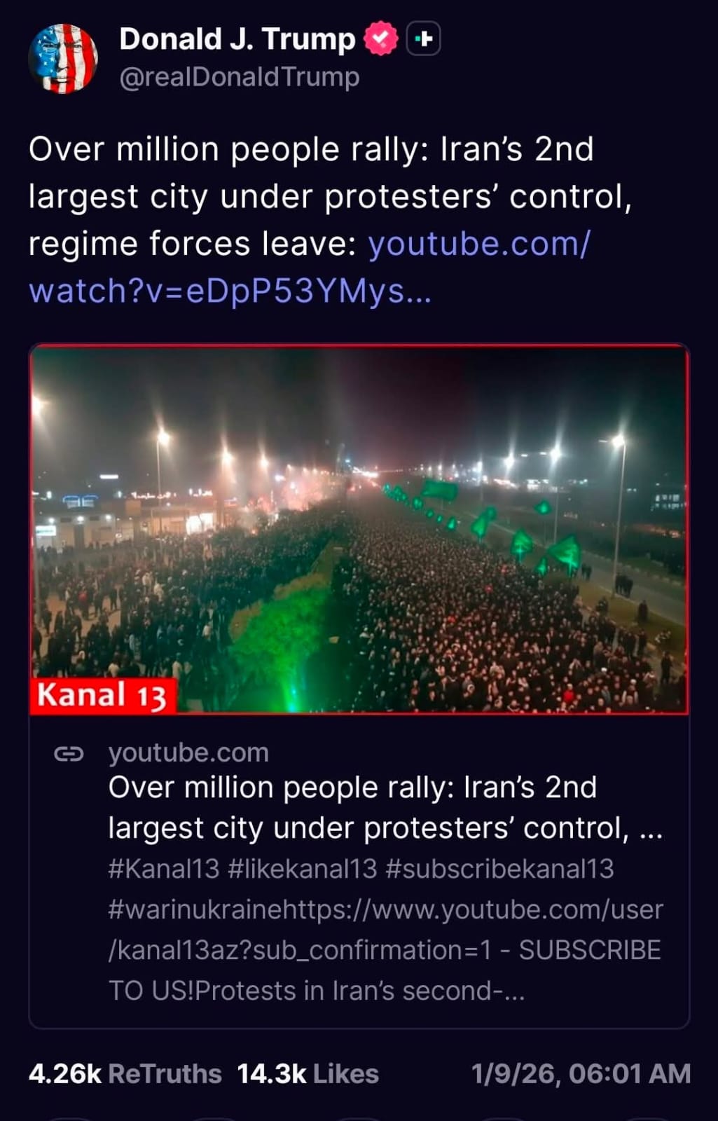 İranda baş qaldıran genişmiqyaslı etirazlar və ölkənin ikinci ən böyük şəhərinin (Məşhəd) nümayişçilərin nəzarətinə keçməsi barədə xəbərlər dünya mediasının diqqət mərkəzindədir. Lakin bu hadisələr fonunda Azərbaycanın müstəqil media orqanı olan Kanal13 tarixi bir uğura imza atıb. Belə ki, ABŞ Prezidenti Donald Tramp, İrandakı son vəziyyətlə bağlı öz “Truth Social” hesabında Kanal13 tərəfindən yayımlanan görüntüləri paylaşıb.